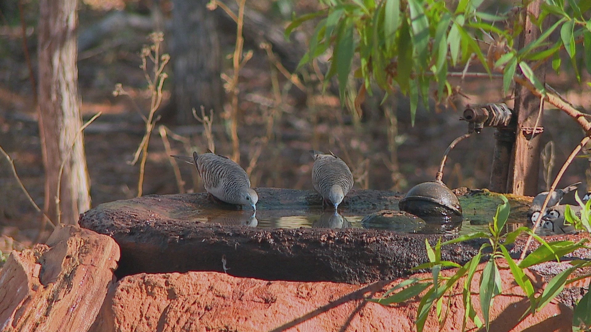 ✨ A rustic bird bath in a tropical garden with playful small birds
