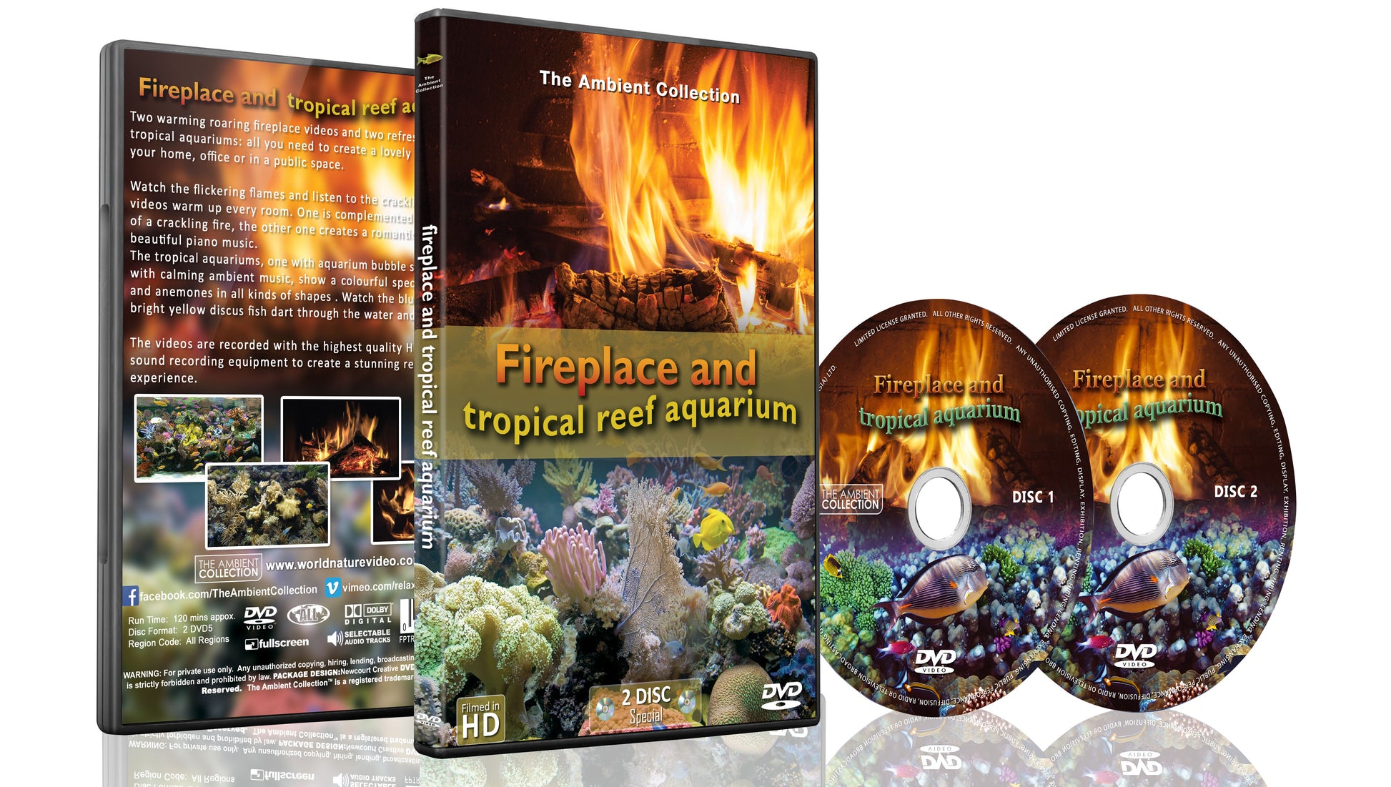 Enjoy roaring fireplaces and crystal-clear tropical aquariums in this 2-disc DVD set. Perfect for creating a cozy and stylish lounge ambiance at home, in the office, or in public spaces like spas, restaurants, and waiting rooms.