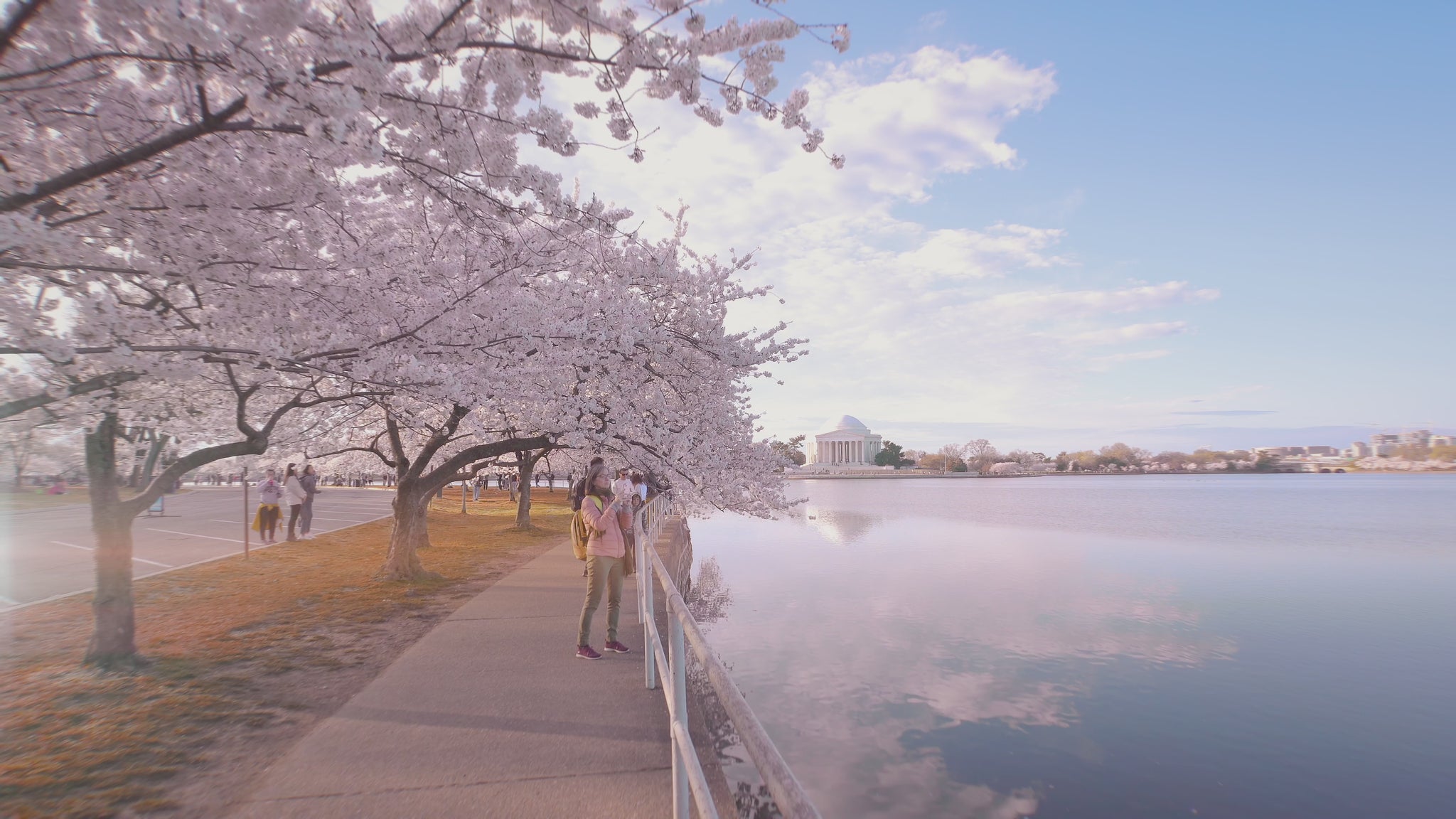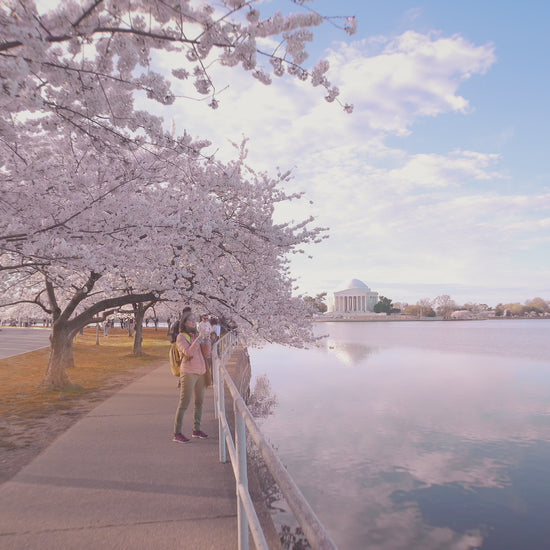 Enjoy a magical walk through Washington, DC in the USA and marvel at the beauty of the cherry blossoms in full bloom. Follow the path beside the water as the trees arch overhead, creating a soft tunnel of petals and springtime color. The gentle breeze, shimmering reflections, and the delicate blossoms above you set a calm, almost dreamlike mood.